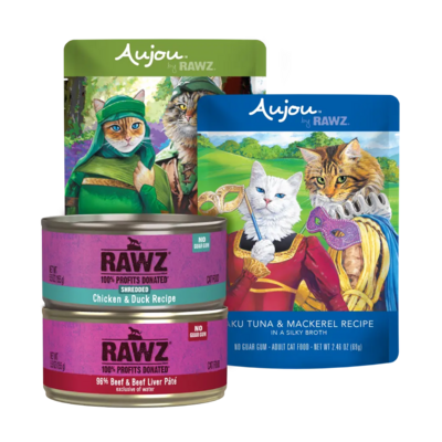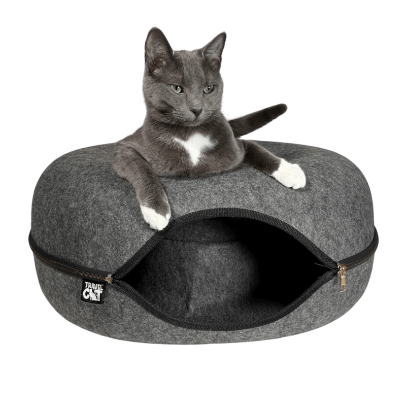 Pictured: Donut Hideaway by Travel Cat and assortment of cat food by Rawz.